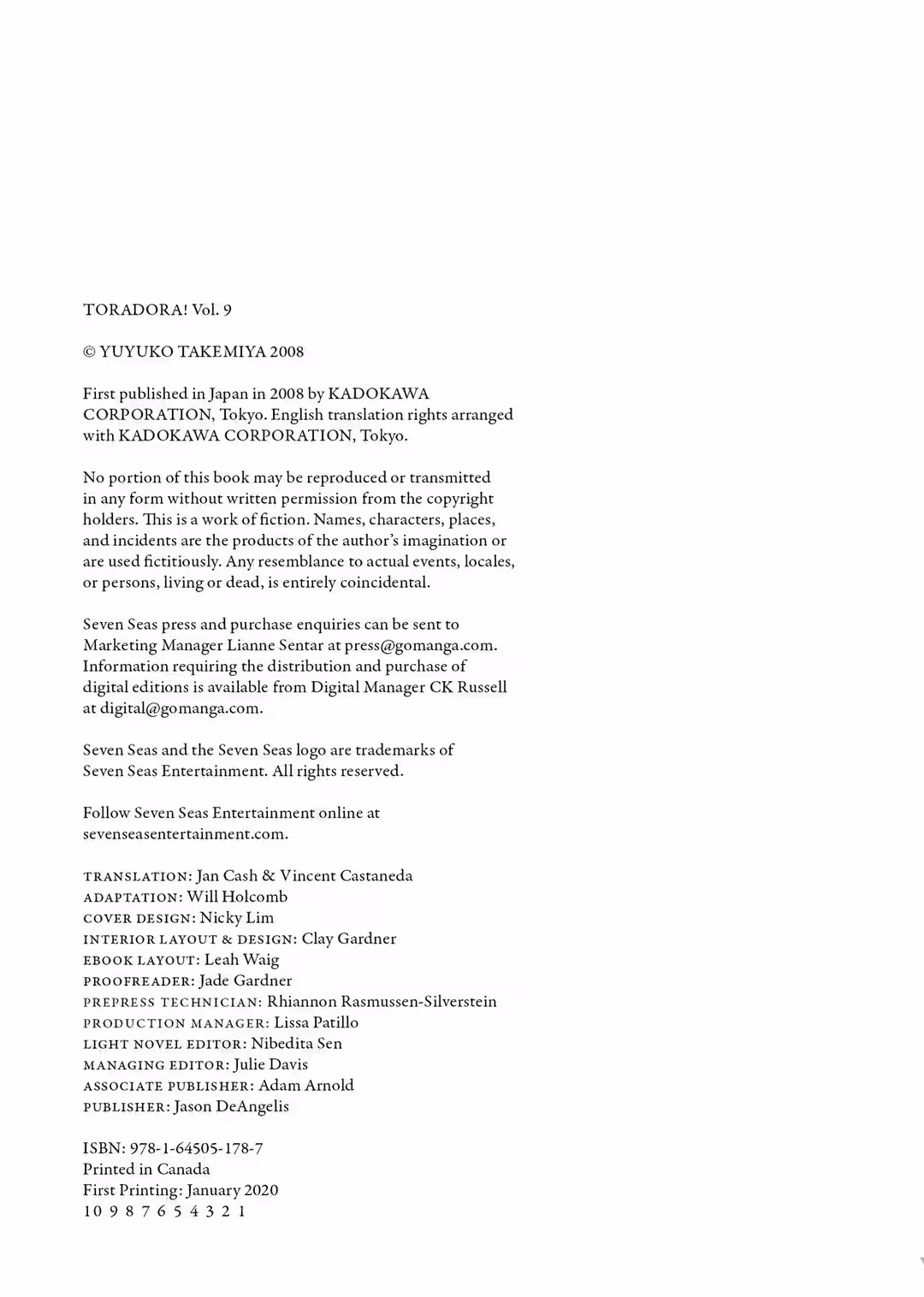 Though I’m in this state, I’ve successfully been able to bring you Toradora! 9 without too much time passing since the last volume. Everyone who has followed along so far, thank you so very much for picking up this book, too! Now that the series has entered its tenth volume, I feel my debt of gratitude toward all my readers piling up. I can’t tell you how grateful I am. My readers all feel so close, so familiar, and so powerful to me. I think that getting these books to you is my one sole, certain bond with you all. That’s why I’m going to keep on writing more and more! I hope that you’ll continue to follow along with me in the future as well!