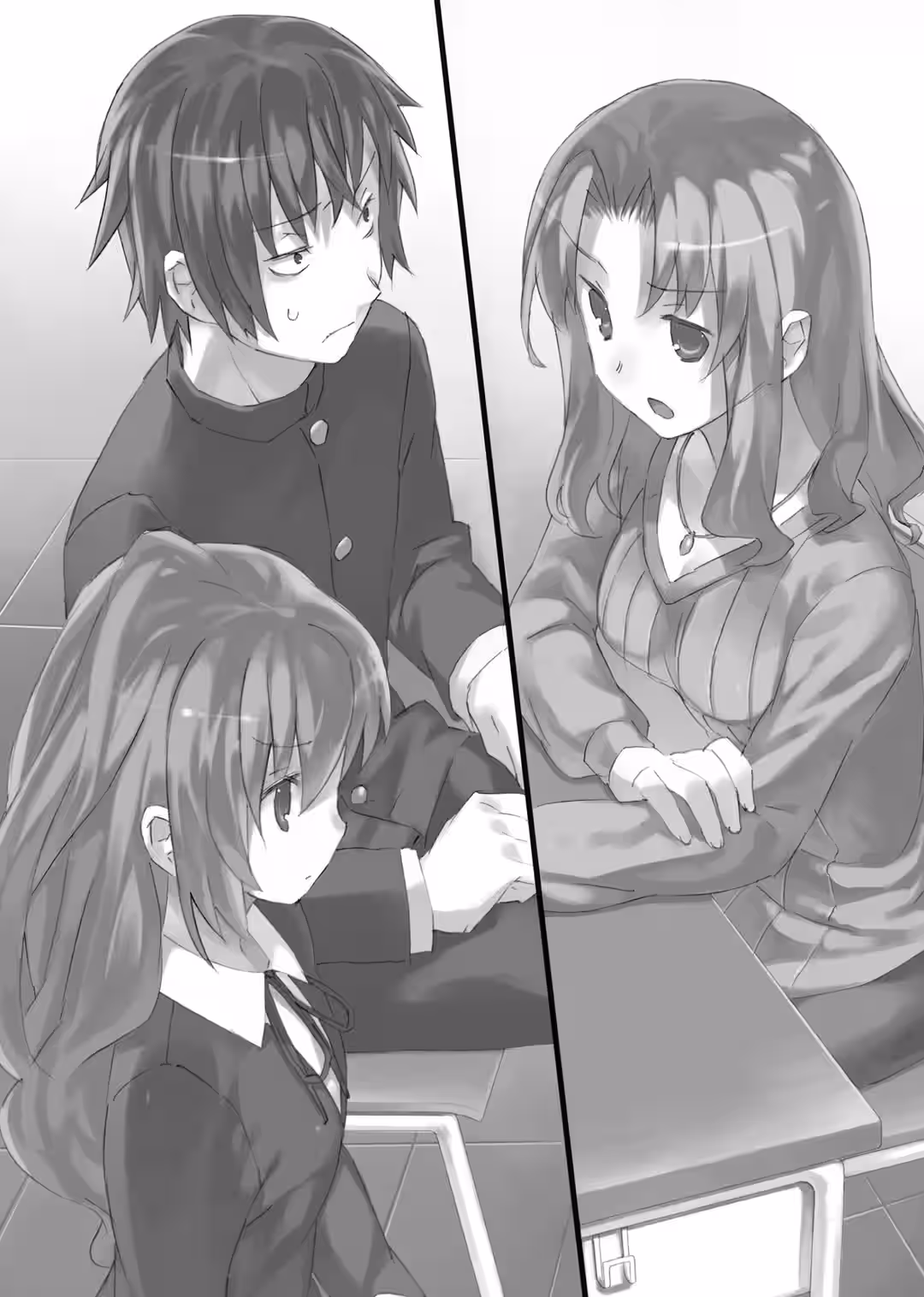 Taiga had said things with her mom had been going swimmingly, but when the woman walked briskly toward Taiga and tried to grab her hand, Ryuuji reflexively pulled Taiga close.