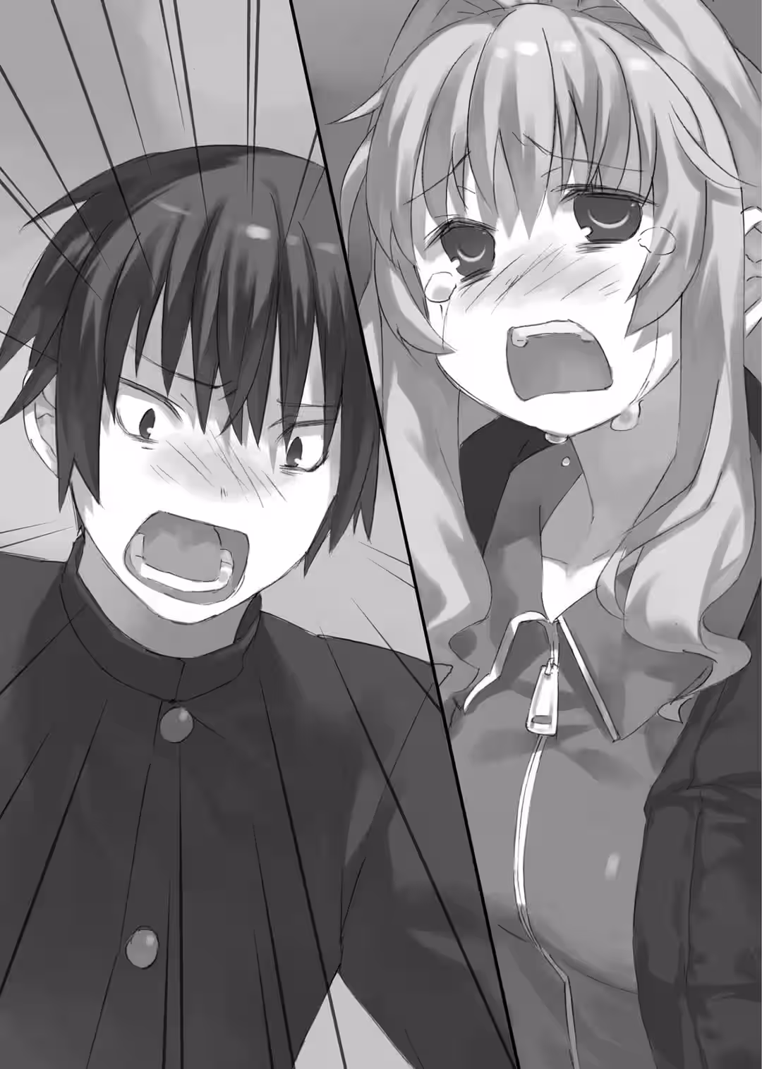 Unable to meet his eyes, Taiga curled her lonesome right hand, which no longer had a place to go, into a fist. She opened it again. Would he hold it again for her? But-but-but—