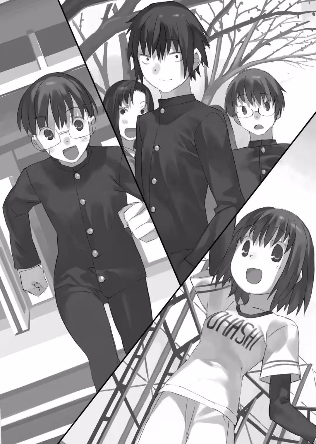 Waving his hand as rigorously as Ryuuji, Kitamura smiled as he ran, his glasses bouncing on his nose. The girls had moved slightly ahead of them, and Minori was calling to end softball early that day like a wartime general. ROUND UP! ROUND UP, MY YOUNG COMPATRIOTS! Noto, Haruta, and Ryuuji waited for Kitamura to catch up to them.