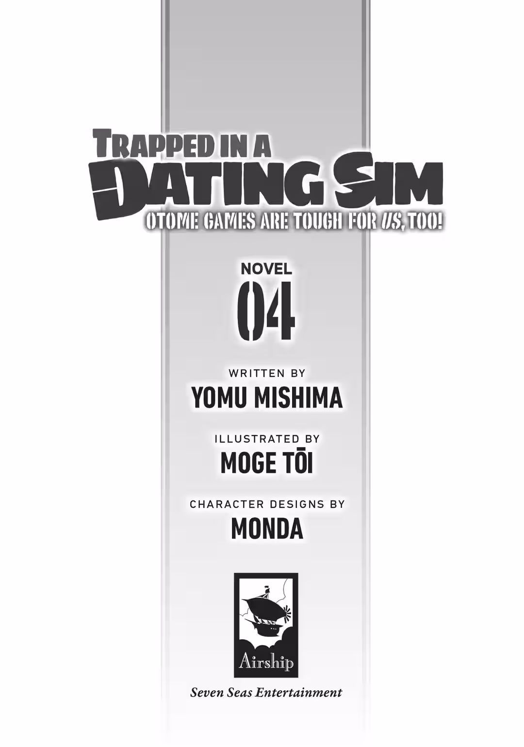 HI, IT’S YOMU MISHIMA—the author whose friends and family assume he’s unemployed because he spends all his time at home writing. We’re finally on the fourth volume of Trapped in a Dating Sim: Otome Games Are Tough For Us, Too! I have all of you to thank for your continued support.