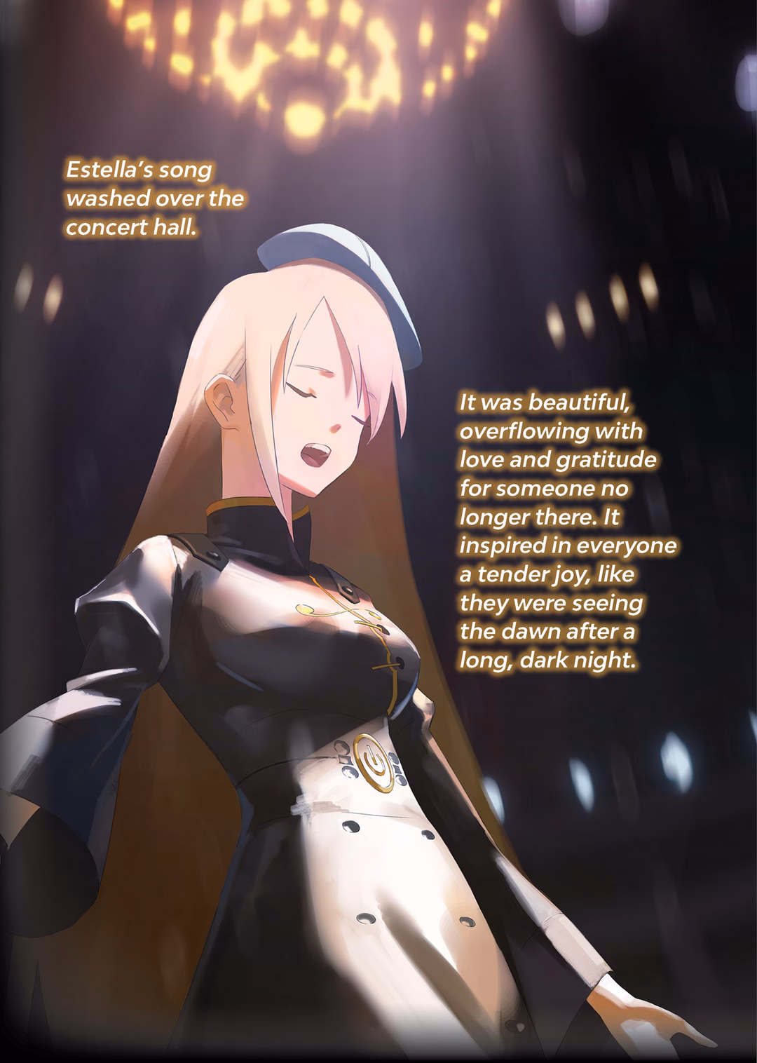 Over a thousand people sat in silence, listening raptly to her heavenly voice. This was the true value of the songstress Vivy, an AI made from humanity’s cutting-edge technology. After the beautiful song finished, the concert hall grew quiet once more.