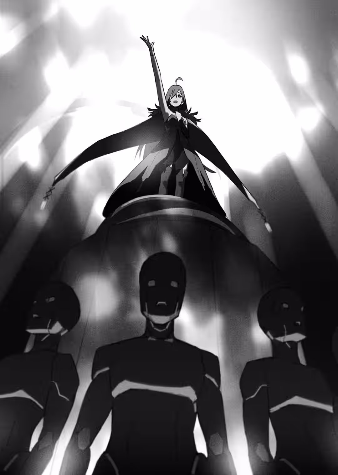 After he said that, Diva slowly stood. She tore off the parts of her tattered costume that were getting in the way and tidied herself up. She smoothed her long, blue, synthetic hair with her hands, brushed off any dirt, and sorted herself out. Her answer to Matsumoto could be found in her form as she carried herself, the same way she would in front of an audience.