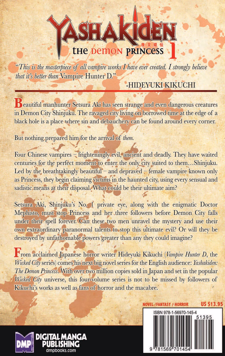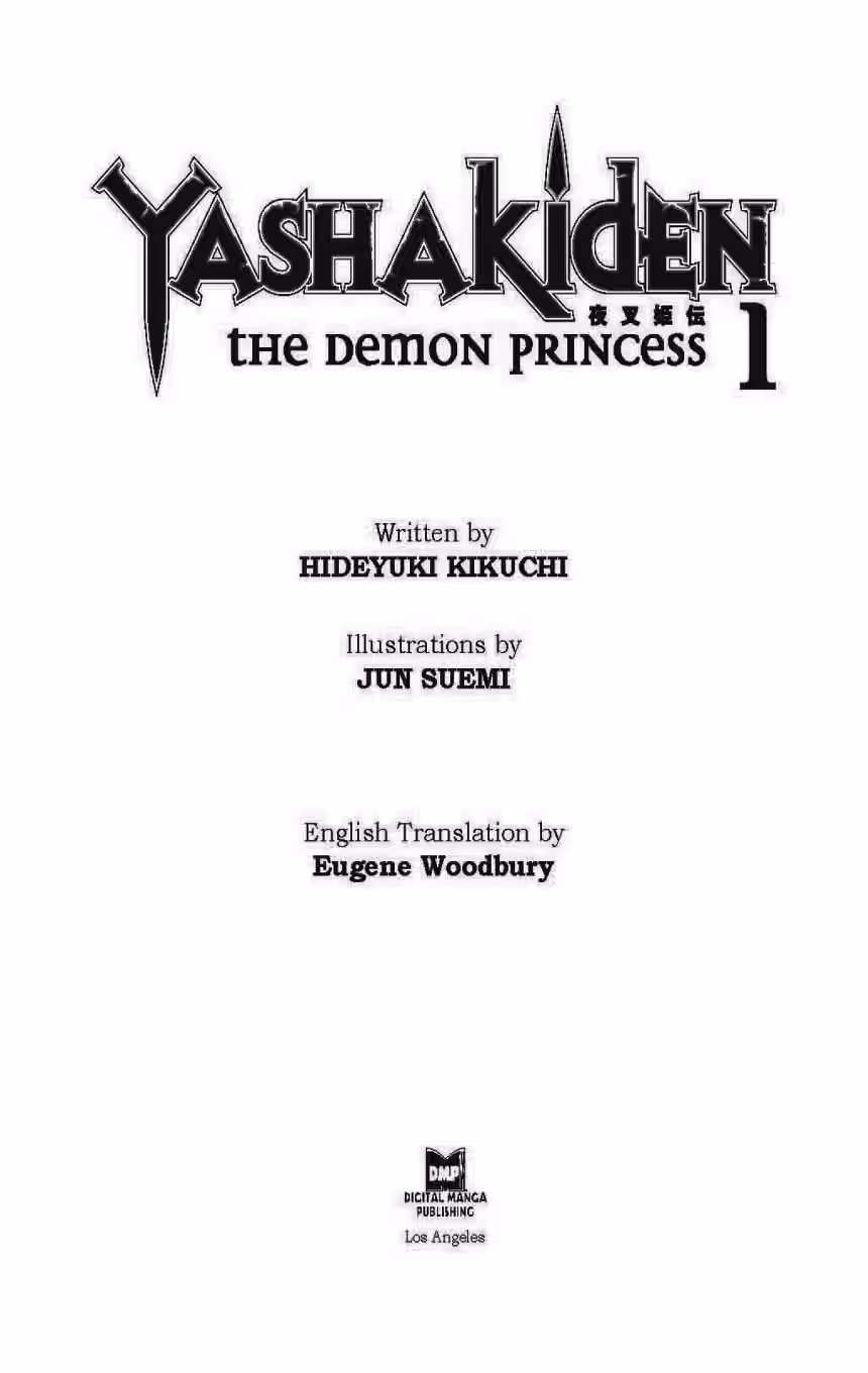Yashakiden:The Demon Princess vol.1 - Yashakiden 1 (c) Hideyuki Kikuchi 1997. Originally published in Japan in 2007 by SHODENSHA Publishing Co.,LTD. English translation copyright (c) 2009 by DIGITAL MANGA, Inc. All other material (c) 2009 by DIGITAL MANGA, Inc. All rights reserved. No portion of this publication may be reproduced or transmitted in any form or by any means without written permission from the copyright holders. Any likeness of characters, places, and situations featured in this publication to actual persons (living or deceased), events, places, and situations are purely coincidental. All characters depicted in sexually explicit scenes in this publication are at least the age of consent or older. The DMP logo is (tm) of DIGITAL MANGA, Inc.