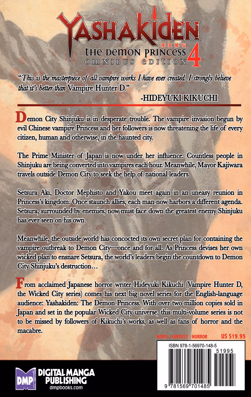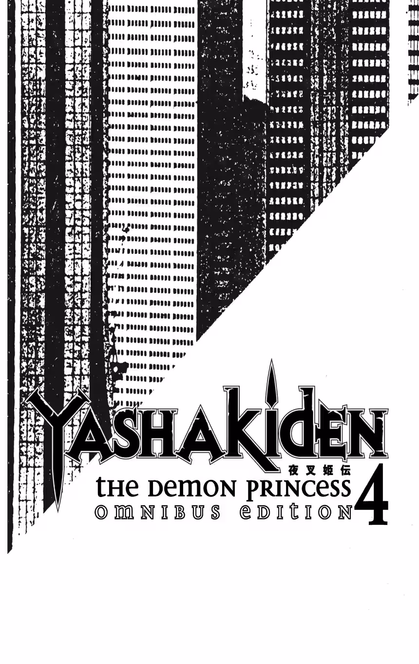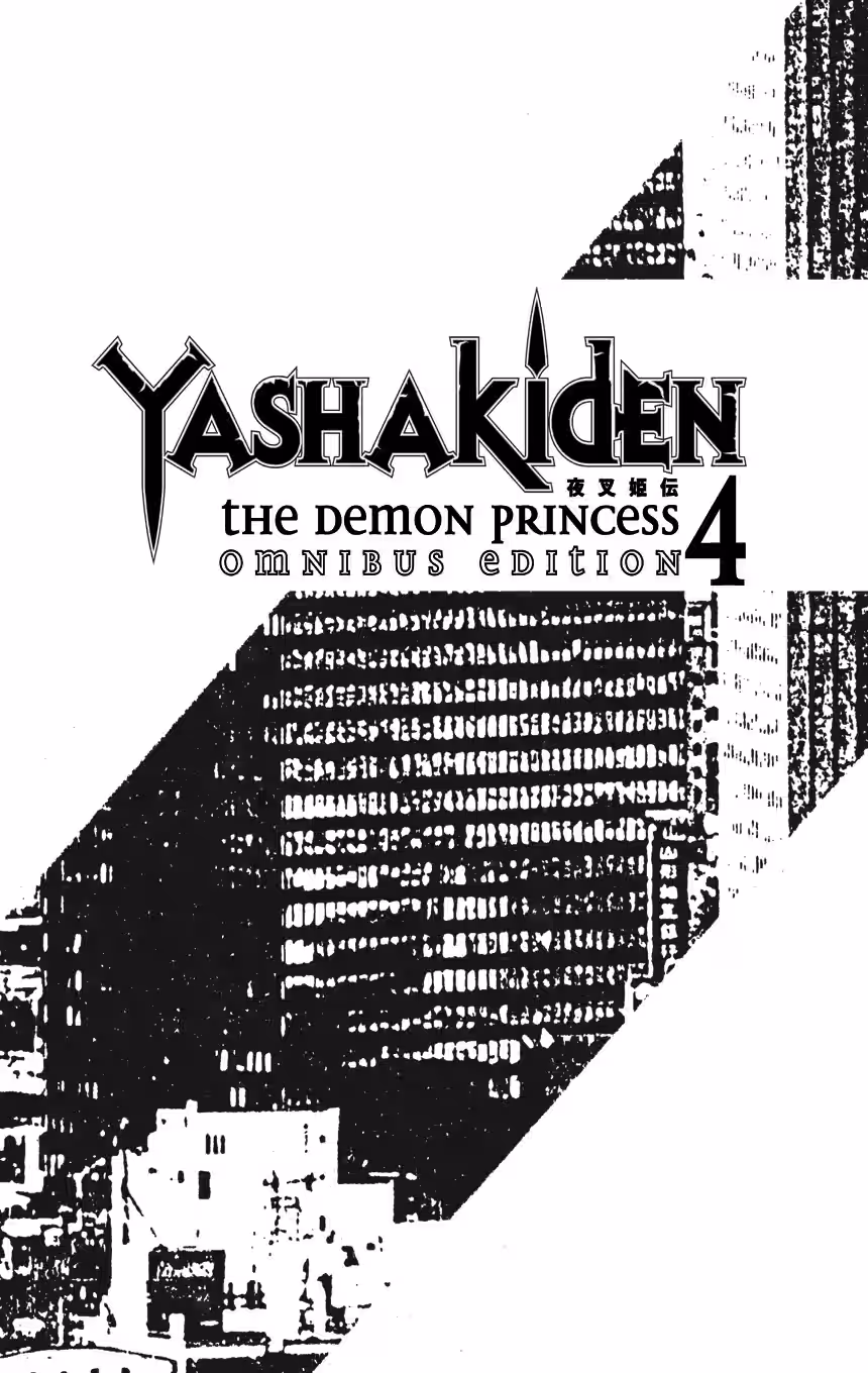Yashakiden:The Demon Princess Vol.4 Omnibus Edition - Yashakiden 3 (c) Hideyuki Kikuchi 1997. Originally published in Japan in 2007 by SHODENSHA Publishing Co.,LTD. English translation copyright (c) 2011 by DIGITAL MANGA, Inc. All other material (c) 2011 by DIGITAL MANGA, Inc. All rights reserved. No portion of this publication may be reproduced or transmitted in any form or by any means without written permission from the copyright holders. Any likeness of characters, places, and situations featured in this publication to actual persons (living or deceased), events, places, and situations are purely coincidental. All characters depicted in sexually explicit scenes in this publication are at least the age of consent or older. The DMP logo is (tm) of DIGITAL MANGA, Inc.