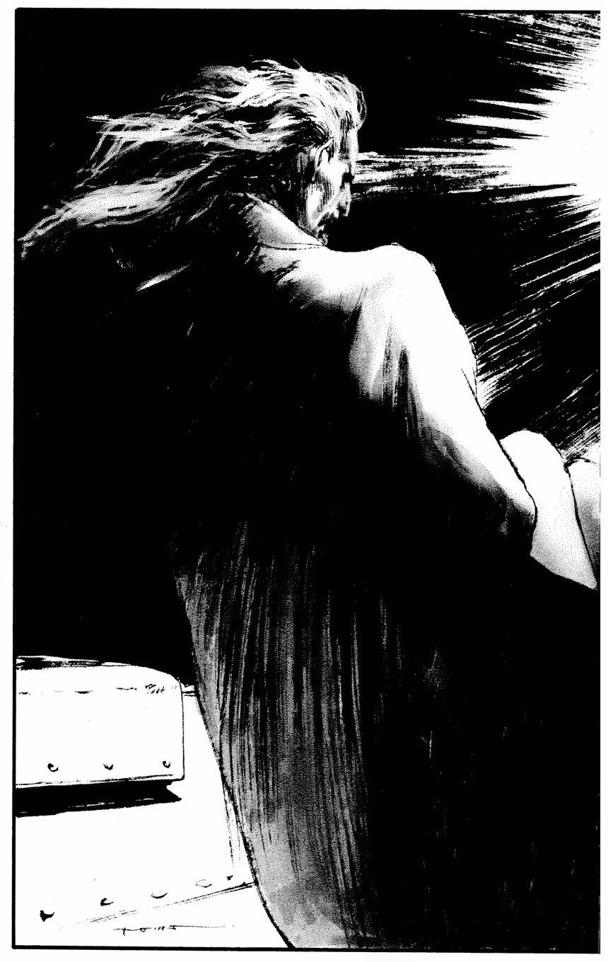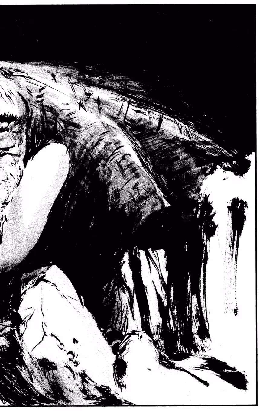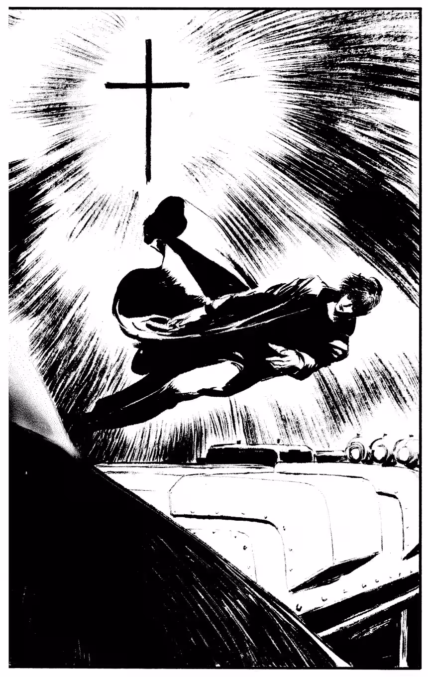 D crosses swords with a rival. Their paths intersect in the air and fly apart. The action advances frame by frame as he lays out the scene with a detailed and dynamic eye. No more than five seconds would have elapsed in real time, but reading to the end may take a minute. The visual imagery is so clearly created that it should be savored slowly.
