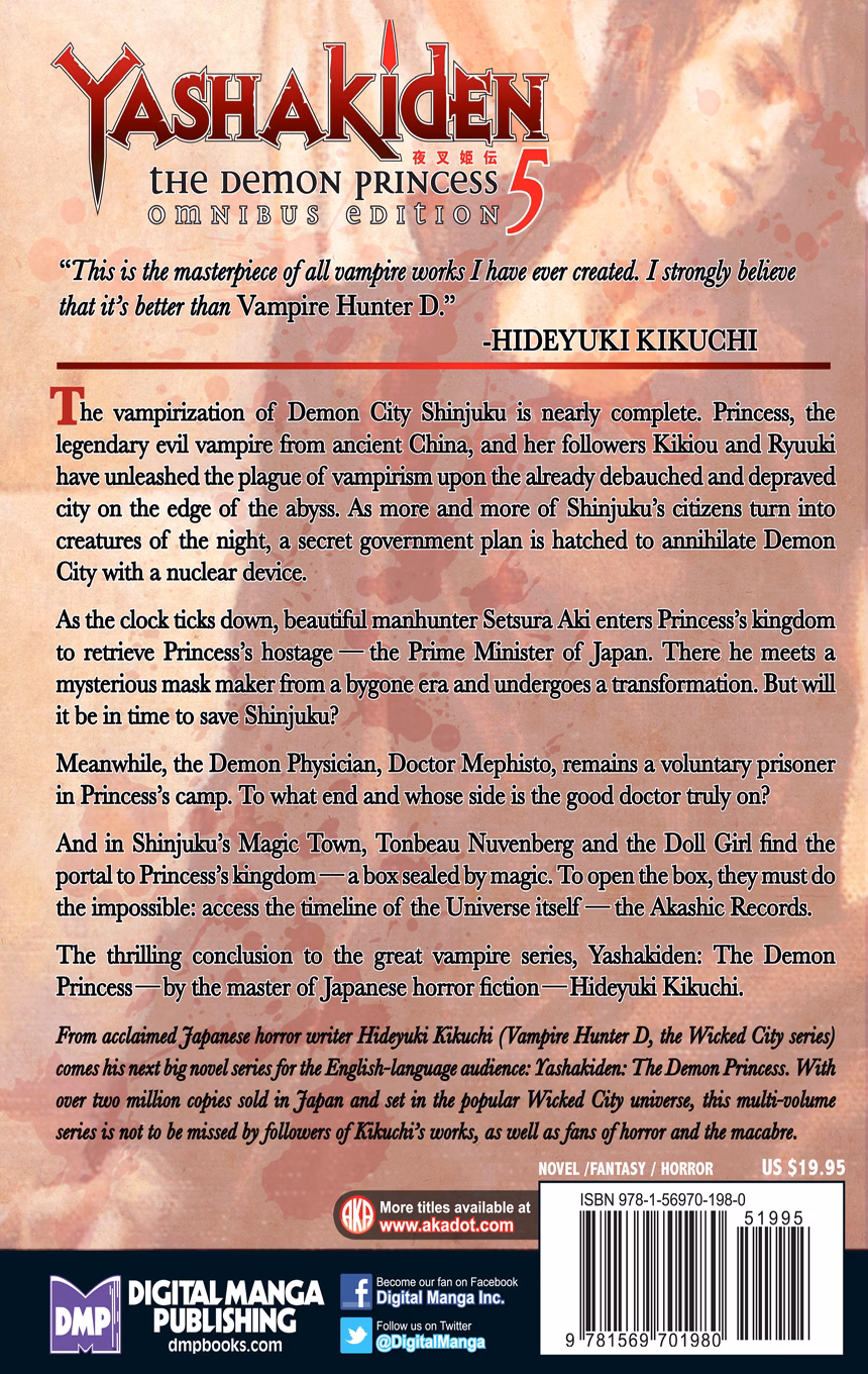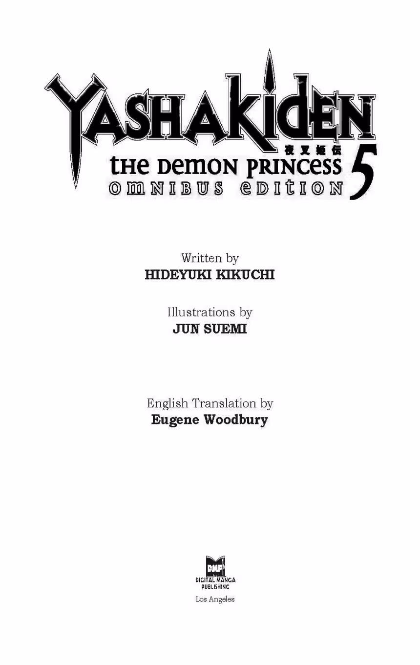 Yashakiden:The Demon Princess vol.5 - Yashakiden 4 (c) Hideyuki Kikuchi 1997. Originally published in Japan in 2007 by SHODENSHA Publishing Co.,LTD. English translation copyright (c) 2012 by DIGITAL MANGA, Inc. All other material (c) 2012 by DIGITAL MANGA, Inc. All rights reserved. No portion of this publication may be reproduced or transmitted in any form or by any means without written permission from the copyright holders. Any likeness of characters, places, and situations featured in this publication to actual persons (living or deceased), events, places, and situations are purely coincidental. All characters depicted in sexually explicit scenes in this publication are at least the age of consent or older. The DMP logo is (tm) of DIGITAL MANGA, Inc.