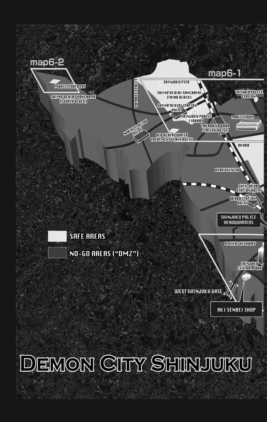 “The remains of a village occupied long before the Hsia Dynasty. No humans live there now. In their place are strange and curious creatures. You’d better hurry up and find the prime minister and the rest of them before they become their next meal. I’ll wait beneath that pine tree. When you return, our little game will be over. If you wish to save Shinjuku, if you truly value the lives of your compatriots—those seven hours will fly by in a flash.”
